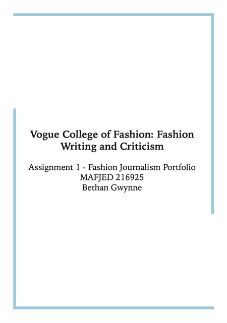 During my time at the prestigious Vogue College of Fashion, where I pursued a Master’s degree in Fashion Journalism and Editorial Direction, I had the opportunity to immerse myself in one of the most dynamic and influential environments in the fashion industry. The college, renowned for its strong ties to Vogue magazine and its cutting-edge approach to fashion education, offered a rigorous and inspiring curriculum that combined practical editorial training with in-depth cultural and industry analysis. The course equipped me with the tools to craft compelling narratives, produce high-quality editorial content, and develop a critical voice in fashion media. Below are selected examples from my portfolio and academic work completed during my studies.